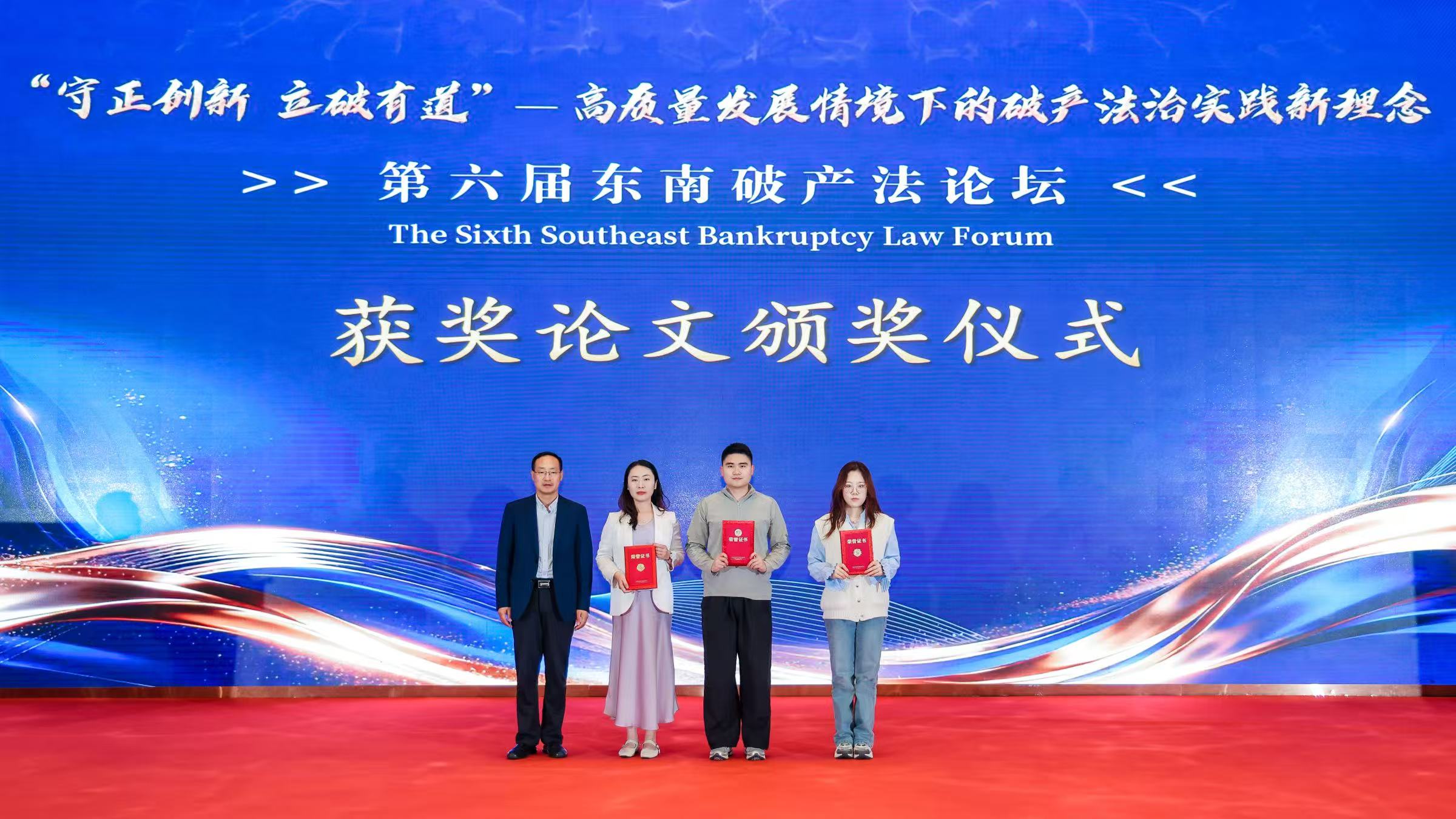 公司经济法研究所所长王斐民教授受邀参会,在第三分论坛“个人破产制度的构建与完善“对来自学界、人大、法院和破产行政事务管理机构的学者、专家的发言进行了精彩点评,在“破产实务圆桌对话”环节发表“破产信用修复的关键问题与破解之道“的演讲,并在优秀论文颁奖环节为获奖作者代表颁发荣誉证书。